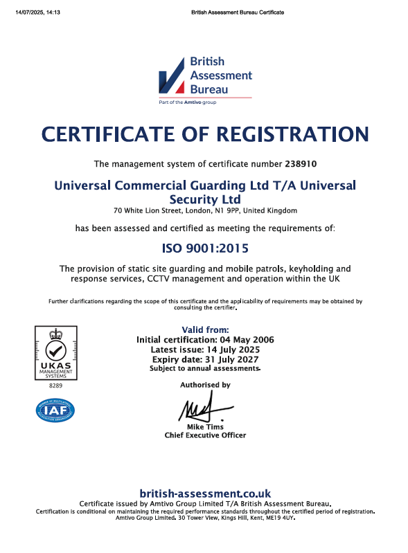 - BS7984 – Keyholding and Response Services – Code of Practice